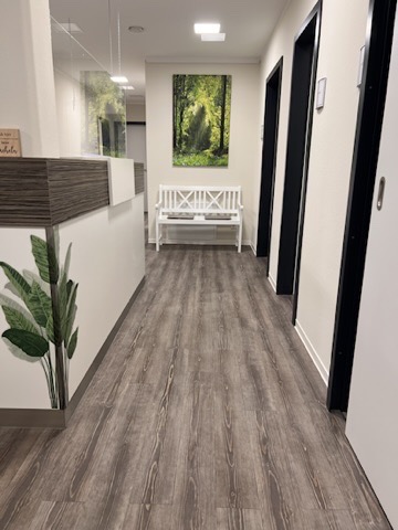 Nachher: Die Ecke wurde „entschärft“, eine Sitzbank lenkt den Blick und ein Akustik-Bild mit Naturmotiv verbessert Klang und Atmosphäre. So entsteht ein freundlicher Empfang, der Vertrauen schafft und für Ruhe sorgt.